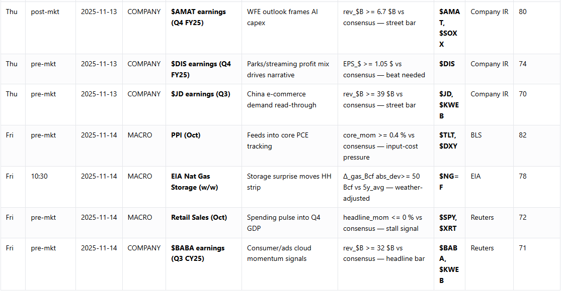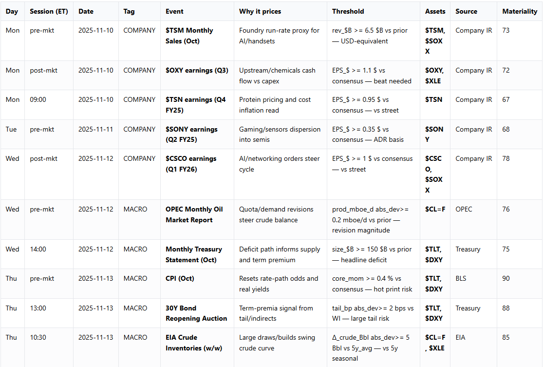 Next week’s primary rate/FX drivers are CPI (Thu pre-mkt, materiality 90; core_mom threshold 0.4%) and the 30Y reopening auction (Thu 13:00, materiality 88; tail_bp threshold 2 bps). A core CPI print ≥0.4% would lift real-yield repricing and dollar strength, pressuring long-duration equities and boosting TLT volatility; a sizable tail at the 30Y auction (>2 bps) would raise term premia and steepen local curves, again weighing on duration. Secondary drivers: EIA crude (Thu 10:30; 5.0 Bbl abs_dev) and PPI (Fri pre-mkt; core_mom 0.4%) will steer energy breakevens and input-cost expectations.