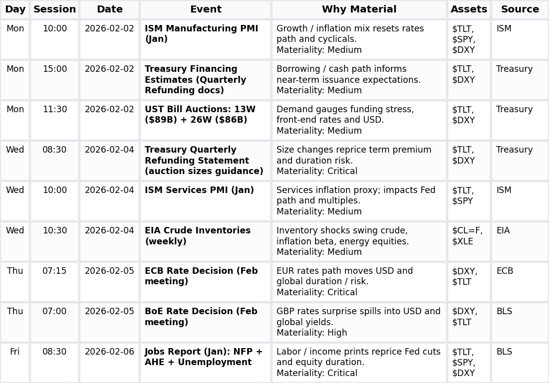 • Labor market (NFP): Jan jobs report at 08:30 ET shapes cuts timing and equity duration; wages→inflation→yields→equities/USD — $TLT, $SPY, $DXY