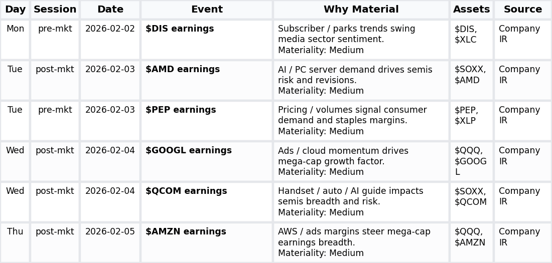 • Semiconductors/AI (EARNINGS): AMD and QCOM shape datacenter, handset, and auto demand assumptions; numeric anchor: N/A; end‑demand→semis revisions→tech risk — $AMD, $QCOM, $SOXX, $SPY