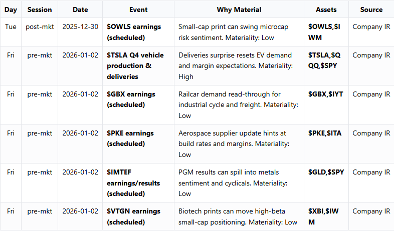 • Production/operations bucket (TSLA deliveries; materiality 88) — units/mix→margin expectations→mega‑cap beta; numeric anchor: ≥0.03M units vs consensus — $TSLA, $QQQ, SPY 0.00%↑