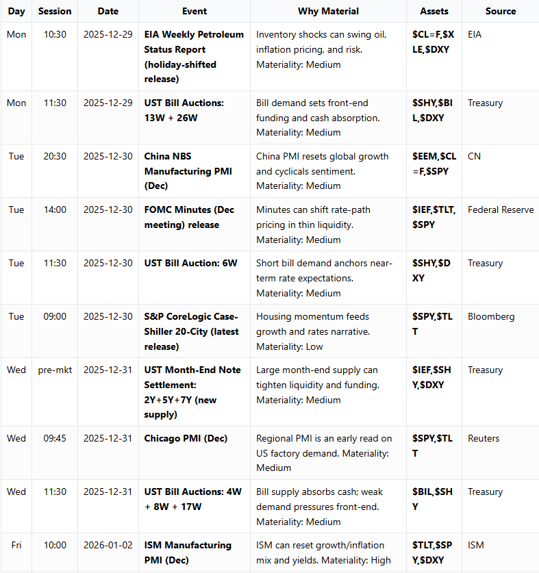 Summary: Next week is macro-heavy despite thin liquidity, with manufacturing PMIs, Fed minutes, and bill supply likely steering rates, USD, and cyclicals. Energy balances via EIA and Treasury settlements could add noise in front-end funding and oil-sensitive risk.