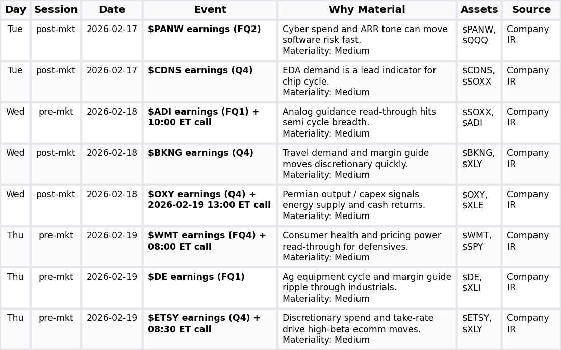 • Earnings — from $PANW, $CDNS, $ADI, $BKNG, $OXY, $DE, $WMT, $ETSY — numeric anchor: N/A; results/guidance steer growth, margins and capex expectations → sector leadership and index breadth in $QQQ, $XLY, $XLE, $XLI, $SPY