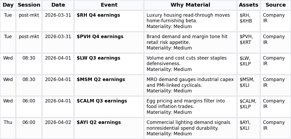 Next week is skewed toward sector dispersion rather than broad index beta, with a cluster of mid-cap earnings across discretionary, staples and industrials. The main themes are U.S. consumer resilience, housing-adjacent demand and industrial capex, with read-throughs to $XRT, $XLP, $XLI and, by extension, $SPY.