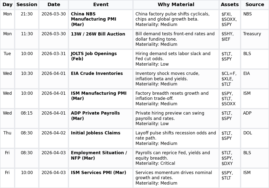 Next week’s macro tape is labor- and activity-heavy, with U.S. payrolls, ISM surveys and claims likely to dominate. These prints, alongside China’s PMI and EIA inventories, mainly reprice rates and the USD, with secondary effects on cyclicals, energy and broad risk proxies.