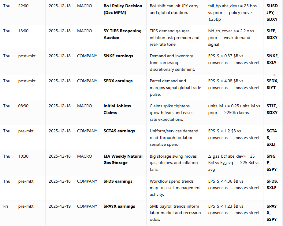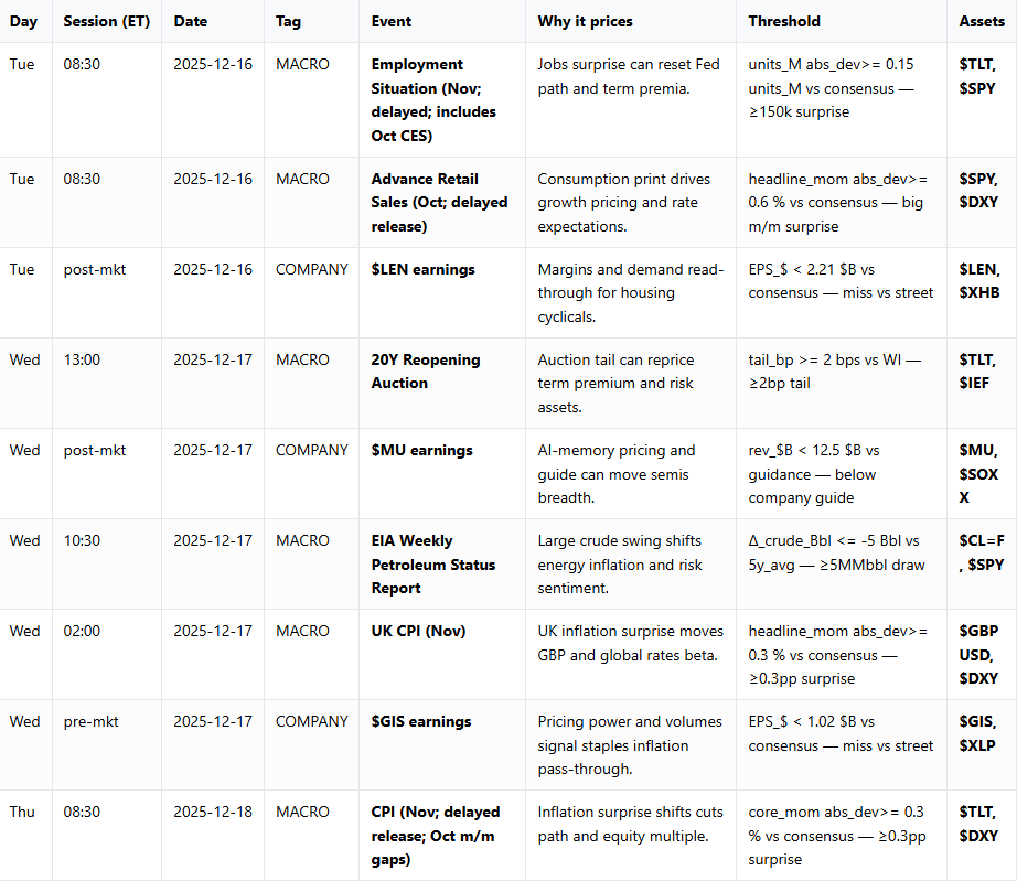 Company catalysts are concentrated but macro‑sensitive. In housing, $LEN’s Tuesday post‑market earnings (score 72) will show whether margins and demand still support $XHB after the Fed’s third 25 bp cut. Staples tone comes from $GIS Wednesday pre‑market (score 70), where EPS and GM outcomes versus $1.02 consensus will test pricing power in $XLP. Semis leadership faces a key read with $MU Wednesday post‑market (score 84); revenue vs $12.5B guidance and GM could either validate or challenge this week’s AVGO‑driven AI‑margin reset in $SOXX. Thursday brings read‑across on services ($CTAS), data/financials ($FDS), transports ($FDX), and discretionary ($NKE), with pre‑/post‑market timing shaping gap risk for $XLI, $XLF, $IYT, and $XLY.
