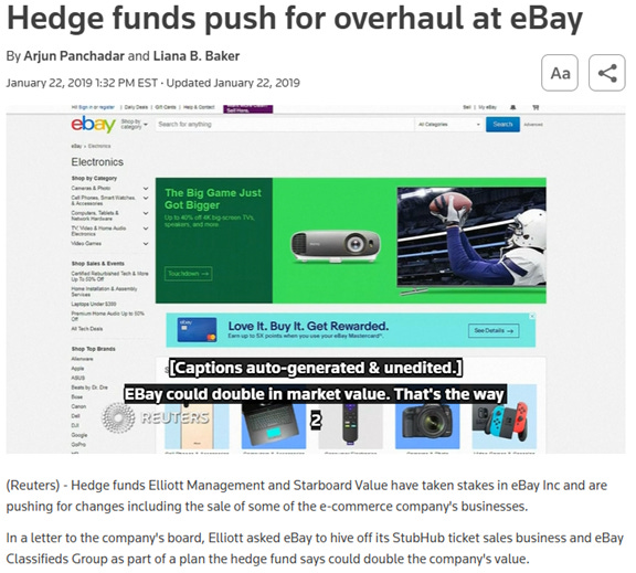 The cleanest case study is eBay. In January 2019, Reuters reported that Elliott had built a stake of more than 4% and publicly pushed eBay to separate StubHub and Classifieds, arguing the stock could reach $55 to $63 by 2020 if the company restructured. The stock immediately reacted, rising as much as 12% and trading up 5.7% to $32.78, after having lost roughly a quarter of its value the year before. That first jump matters because it shows the market understood the thesis right away: portfolio simplification, asset monetization, and governance pressure were suddenly on the table.