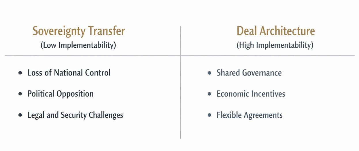 This is where “ownership” becomes a negotiating instrument rather than a legal blueprint. High-intensity rhetoric can compress the bargaining range toward outcomes that feel control-like in practice, even if formal sovereignty never moves. A deal architecture can convert today’s access into higher-certainty permissions, accelerated capability expansion, stronger exclusion mechanisms, and durable economic alignment.